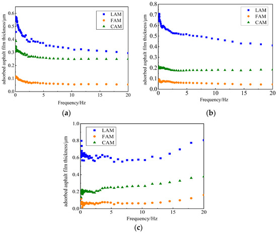 Figure 13 demonstrates that adsorbed asphalt film thickness varies with experimental frequency, reflecting changes in interaction capability. Thus, the interaction capability between asphalt and mineral filler is frequency-dependent. Figure 13a,b indicate that at 28 °C and 40 °C, adsorbed asphalt film thickness decreases as frequency increases. This suggests that at lower temperatures, increasing frequency weakens the interaction capability between asphalt and mineral filler. As frequency increases, the shear modulus of asphalt and asphalt mastic rises, causing asphalt to gradually transition from viscoelastic to elastic behavior [44]. This transition reduces the wetting ability of asphalt, thereby weakening its interaction with the mineral filler. Figure 13c reveals that at 52 °C, adsorbed asphalt film thickness increases with frequency. Since this temperature surpasses the asphalt softening point (48 °C), the material transitions from a semi-solid to a viscous flow state. At this stage, the wetting effect of asphalt outweighs the influence of frequency, enhancing its interaction with the mineral filler.