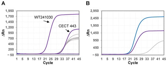 Amplification plots of (A) S. enterica subsp. enterica sv. Typhimurium strains WT241030 and CECT 443, S. enterica subsp. enterica sv. Typhi CECT 409T, S. enterica subsp. enterica sv. Paratyphi A CECT 825, S. enterica subsp. enterica sv. Enteritidis CECT 4155, S. enterica subsp. arizonae CECT 4395, and S. enterica subsp. salamae CECT 4000T and (B) Primun Salmonella T vaccine (ST0116-MSB). The figure shows amplification with the SalTypm assay in purple (Cy5), the PriSal-T assay in blue (FAM), and the internal control in grey (HEX).