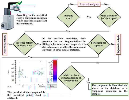 To confirm the identification of compounds detected by this high-resolution tech-nique in Croatian whiskies, two main criteria were used, the exact mass of each compound and the deviation from the isotopic pattern quantified as mSigma by the T-Rex 3D algorithm in MetaboScape. This calculation algorithm, adopted from Castillo et al. [24] and illustrated in Figure 1 is created establishing values of 5 ppm and 50 mSigma as the maximum acceptable deviations of the mass of the compound and the isotopic pattern, respectively.