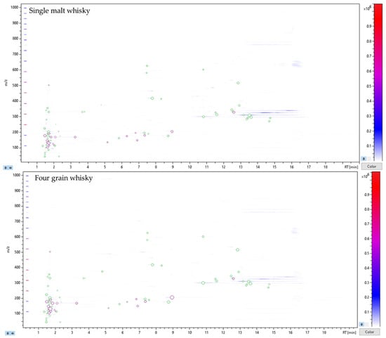 This section was addressed in terms of the potential formation of specific compounds during the whisky production process, from raw material to maturation, due to the presence of non-specific and non-volatile compounds that can often arise as by-products or precursors of certain reactions. Results from the PCA model analysis, shown in Figure 2, illustrate a “topography view” presenting the intensities of the compounds plotted against their retention time and m/z values. In the figure, each circular marker represents an analyte, positioned at its primary ion’s retention time and m/z. The color-coded intensity scale (on the right) represents the highest intensity in that particular area displayed. This tool enables simple grouping of compounds with similar retention times and mass profiles, making it convenient to categorize the analyzed untargeted compounds.