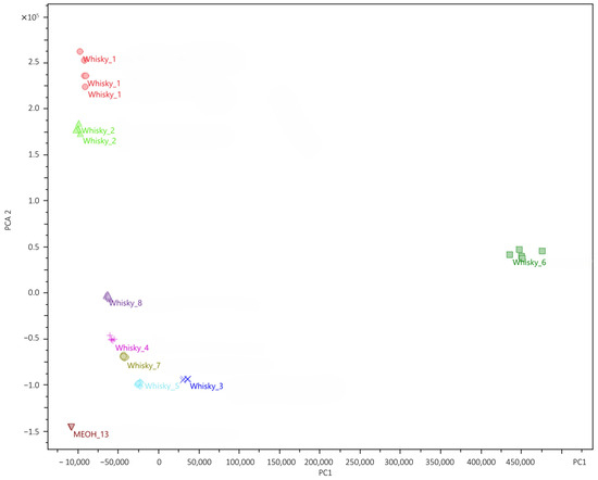 Principal Component Analysis (PCA) plot of different whisky samples analyzed using UHPLC-QTOF. Whisky 1: Croatian single malt whisky; 2: Croatian four grain whisky; 3: blended Scotch whisky; 4: single malt Scotch whisky; 5: blended Scotch whisky; 6: single malt Scotch whisky; 7: blended Scotch whisky; 8: blended Scotch whisky; MEOH: methanol.