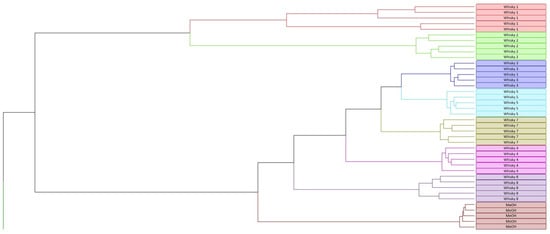 Dendrogram of clustering based on the similarity matrix of analyzed whiskies. Red: Croatian single malt whisky, light green: Croatian four grain whisky, dark blue: blended Scotch whisky, pink: single malt Scotch whisky, light blue: blended Scotch whisky, dark green: single malt Scotch whisky, olive: blended Scotch whisky, purple: blended Scotch whisky, brown: methanol.