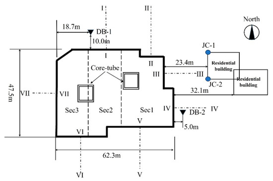 The project under study is for a shantytown renovation in Beijing; the surrounding environment is complex, with some existing buildings on the east side of the area and a subway station on the west side. The plots are planned to be 5 floors underground and 23 floors above ground, adopting the method of synchronous construction of the superstructure and substructure under a semi-top-down construction method. In this project, the foundation pit is 62.3 m east–west and 45.7 m north–south, and the excavation depth is set to be 25.5 m. The diaphragm walls with a depth of 36.5 m were used as the foundation pit retaining structures, and the vertical supports adopted integrated piles and columns. Figure 1 presents the relationship between the foundation pit and the existing buildings; the distance between them is 23.4 m and 32.1 m, respectively. Meanwhile, the monitoring points used to validate the numerical model in this article are also marked in Figure 1, where DB-1 and DB-2 are the two monitoring points of ground settlement, and JC-1 and JC-2 are used to monitor the building subsidence. For the convenience of analyzing the calculation results, the side walls of the pit are numbered clockwise according to I to VII. Correspondingly, the monitoring sections set perpendicular to them in the middle of each wall are numbered as I–I, II–II, III–III, IV–IV, V–V, VI–VI, and VII–VII.