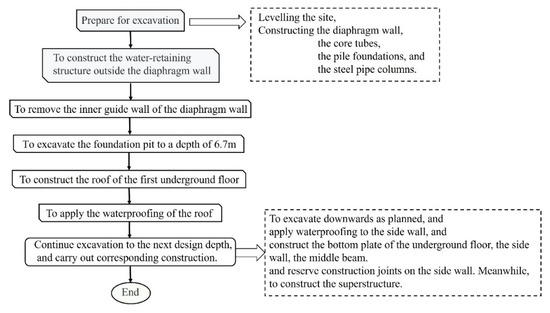 In the project, a method of synchronous construction of the superstructure and substructure was adopted, that is, the superstructure was constructed by the traditional bottom-up method, and the substructure was constructed simultaneously using a covered semi-top-down construction method, as shown in Figure 2. The construction processes are detailed as follows.