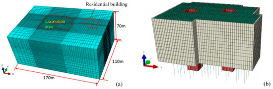 The finite-element model for the excavation area and surrounding site is shown in Figure 3a,b which present the structure of the excavation area.