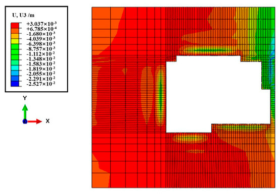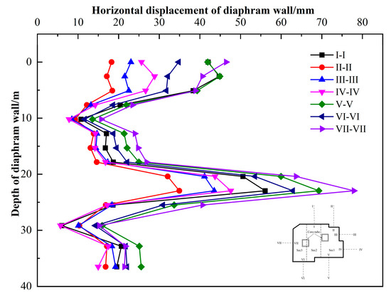 Figure 6 depicts the horizontal displacement contour maps of the diaphragm wall after construction. As shown in Figure 6, the diaphragm walls show a deformation pointing into the pit, and the deformation distribution has obvious spatial effects. The displacement corresponding to the long side is greater than that corresponding to the short side, and the sudden change in shape of the local position of the foundation pit causes a reduction in the maximum horizontal deformation of the retaining structure. However, since the roof of the first underground floor is built after the excavation of the first underground floor is completed, the top of the diaphragm wall shows a large deformation, which is different from the small deformation of the top of the diaphragm wall adopting the covered top-down method [17,26].