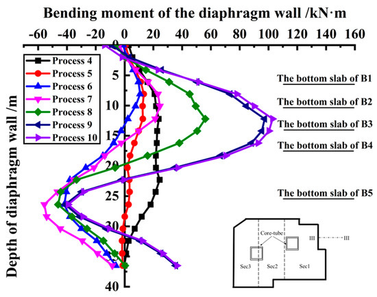 Figure 9 presents the variation in the bending moment of the diaphragm wall at the monitoring section III–III for different construction processes, in which a positive value indicates the deformation of the wall towards the pit due to the compression of the soil mass, and a negative value indicates the deformation of the wall towards the outside of the pit. From Figure 9, it can be concluded that the bending moment at the top of diaphragm wall changes very little (within 20 kN·m) throughout the construction process. The construction processes 4 and 5 cause little change in the bending moment of diaphragm wall, but from process 6 onwards, a large negative bending moment occurs at about 26.4 m at the bottom. It might be due to the deformation of the diaphragm wall pointing to the foundation pit caused by excavation, while the pebble layer at 26.4 m below the ground has a certain inhibitory effect on the deformation of the diaphragm wall, resulting in a large negative bending moment. With the subsequent construction, the maximum positive bending moment of the diaphragm wall gradually increases, and its position gradually moves down, finally stabilizing near the middle of the excavation pit. The maximum positive bending moment of the diaphragm wall reaches 102 kN·m when the construction is finished. The maximum negative bending moment tends to increase then decrease following the construction, which is caused by the floor construction and the roof support, but the position of the maximum negative bending moment does not change with the construction. As shown in Figure 9, process 10, a process of constructing the superstructure above the pit, only leads to an increase of about 5.7% in the maximum positive bending moment of diaphragm wall and has no effect on the maximum negative bending moment. The effect of process 10 on the horizontal deformation of the diaphragm wall can be almost negligible.
