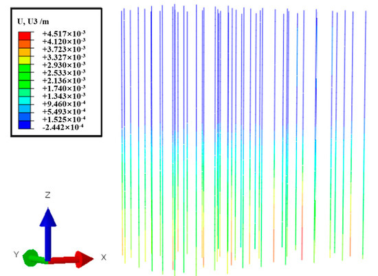 Integrated piles and columns are used as the foundation and internal structural components of buildings under construction and are also constructed before excavation of the pit. Figure 11 gives the vertical displacement contour map of the integrated piles and columns in the pit. It is found that the deformation of columns presents mainly settlement deformation, while the pile has a certain degree of bulge deformation, but the column itself undergoes a certain degree of compression. As we know, the unloading during excavation causes the floating of the integrated piles and columns, but the weight of the superstructure and substructure leads to the settlement of the integrated piles and columns, with the combination of the two effects resulting in the sinking of the columns and the floating of the support piles. However, the maximum floating is only 3.3 mm, and the maximum sinking is only 4.5 mm, with neither of them reaching half of the control value (10.0 mm). Therefore, the integrated piles and columns used as vertical supports in the pit are in a safe condition during the whole construction process.