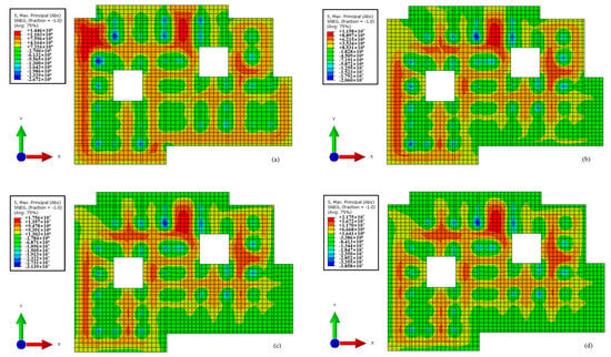 Figure 12 presents the stress contour maps of the roof of the first underground floor at the end of each construction process, where positive values represent tensile stress and negative values represent compressive stress. From Figure 12, it can be seen that as the construction progresses, the tensile stress distribution of the top roof of the first underground floor only slightly changes, while the compressive stress distribution changes significantly between the 4th and 7th processes, but the change is very small after the 7th process, with most floors in a compressed state. Tensile stress takes on a cross-distribution pattern and mainly distributes between columns and columns or columns and side walls. Meanwhile, the compressive stress mainly appears at the intersection between the roof of the first underground floor and the columns. The tensile stress and the compressive stress increase with the construction process, but the maximum tensile stress and the maximum compressive stress suddenly increase by about 10 times between process 4 and process 5 due to the gravity load of the superstructure during synchronous construction. From process 5 to process 10, the maximum tensile stress and the compressive stress both increased by about 4 times. As the construction progresses, the ratio of maximum compressive stress to maximum tensile stress gradually decreases but remains around 1.8 times. At the end of construction, the maximum tensile stress reaches 46 MPa, and the maximum compressive stress reaches 81 MPa, which both occur on the north side of the pit. These results highlight that it is necessary to strengthen the supervision of the roof of the first underground floor on the north side of the pit during the construction to avoid its cracking and damage affecting the progress of the project.