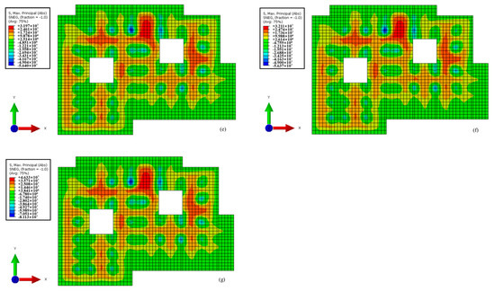Stress contour maps of the roof of the first underground floor. (a) Process 4; (b) process 5; (c) process 6; (d) process 7; (e) process 8; (f) process 9; (g) process 10.