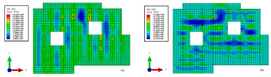 Figure 13 shows the bending moment contour maps of the roof of the first underground floor in the X- and Y-direction at the end of construction, from which it can be found that in the X-direction, the maximum positive bending moment is 3.0 × 106 N·m, and the maximum negative bending moment is 2.0 × 106 N·m. Namely, the maximum positive bending moment is about 1.5 times the maximum negative bending moment. In addition, the positive bending moment is mainly distributed at the intersection between the roof of the first underground floor and the columns, and the negative bending moment mainly takes on a parallel distribution to the Y-axis. In the Y-direction, the maximum positive bending moment is 3.2 × 106 N·m, and the maximum negative bending moment is 1.4 × 106 N·m, which means the maximum positive bending moment is about 2.3 times the maximum negative bending moment. The positive bending moment is mainly distributed at the intersection between the roof of the first underground floor and columns and around them, while the negative bending moment is mainly distributed parallel to the X-axis. Therefore, it is particularly important to pay special attention to the parts with significant changes in the bending moment, especially the north side of the roof of the first underground floor and the intersection between the roof of the first underground floor and the columns, to avoid sudden changes in the stress direction that may cause cracking and other damages.