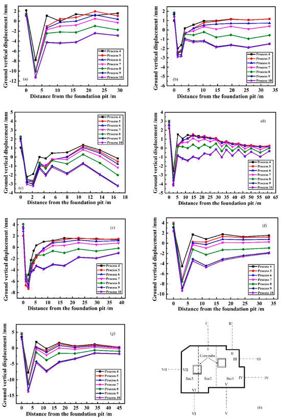 Figure 15 presents the ground settlement troughs of seven monitoring sections during the construction process. As the construction progresses, the settlement continues to increase. From Figure 15, it can be seen that there is uplift deformation near the pit wall, the ground settlement curve shows a clear groove shape, and the settlement reaches its maximum at a distance of about 2.0–3.0 m from the pit wall. Due to the existing residential buildings on the east of the pit, the settlements of monitoring section III–III and section IV–IV increase as the distance from the pit wall increases after exceeding 11.0 m. That of the other monitoring sections are different, manifested as the ground settlements being basically the same, with a slight decrease after the distance from the pit wall exceeding 10.0 m. The construction of process 10 has a relatively minimal impact on the ground settlement, and all the construction processes have no impact on the position of the maximum deformation value of the ground settlement trough. After the completion of construction, the maximum settlement value reaches 13.8 mm, and the maximum uplift value reaches 4.8 mm, both of which are far less than the design control value (30.0 mm), meeting the safety requirements. From Figure 15, the maximum settlement for all sections are approximately between 0.11‰ H and 0.54‰ H (H is the excavation depth of the pit), and the influence range of excavation is between around 0.88 H and 1.37 H, which indicates that the spatial position of the diaphragm wall, the wall length, and the spatial position of existing buildings have a significant impact on the magnitude and the shape of the settlement trough but have little impact on the location of the maximum settlement in the settlement trough. The distribution of the settlement trough indicates that the significant impact range of excavation of the pit in this project is approximately within 10.0 m around the pit. Therefore, it is necessary to strengthen the monitoring of the structures and traffic routes within 10.0 m around the pit to avoid the adverse impact of construction during excavation.