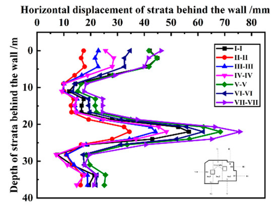 Figure 16 shows the horizontal displacement of strata behind the wall at different monitoring sections after the completion of construction. It is observed that the strata behind the wall have a horizontal displacement towards the pit, and the deformation characteristics are quite similar to that of the diaphragm wall, also showing the shape of “double peaks”, and the deformation values are basically the same, indicating that the deformation of the pit was in a stable state. With the increase in the extension length of the diaphragm wall, the horizontal displacement of strata behind the wall gradually increases, but the maximum displacement always appears around 22.5 m below the ground. The maximum horizontal displacement is about 1.4–2.0 times that of the ground.