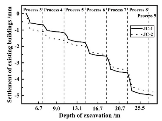 Figure 17 provides the history curves of the settlement of existing buildings during the whole construction process. As can be seen, the deformation trend of the two points is similar. Both of them gradually increase as construction proceeds and present an obvious spatial effect: the settlement rate is fast and the settlement amount is large in the excavation of Sec1, while the settlement rate decreases and the settlement amount is small in the excavation of Sec2 and Sec3. At the beginning of excavation, the settlement of JC-2 is larger than that of JC-1, but as excavation proceeds, the settlement of JC-1 gradually exceeds that of JC-2. The final settlement of JC-1 and JC-2 are 5.0 mm and 4.8 mm, respectively, which are both much less than the design control value (15.0 mm), satisfying the safety requirements.