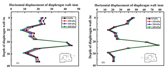 Horizontal displacement of the diaphragm wall for different conditions. (a) Section V–V; (b) section VII–VII.
