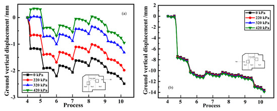 Figure 19 shows the settlement history curves of the ground monitoring points behind the pit wall on the monitoring section of III–III and VII–VII under different buildings loads. It is found that the existing buildings have a significant impact on the ground settlement between them and the excavation pit, while the impact on the site on the other side of the pit is very small. As the building load increases, the ground settlement between the building and the excavation pit decreases, and the final settlement values under the four building load conditions are 2.5 mm, 2.0 mm, 1.3 mm, and 1.0 mm, respectively. However, when the load of existing buildings is 420 kPa, there will be a certain degree of heave at the monitoring point during the initial construction stage; as the construction progresses, the heave gradually transforms into settlement deformation, and the overall shape of the ground settlement curve remains unchanged. Comparing the existing building loads of 0 kPa and 320 kPa, it is found that ground settlement decreased by approximately 47.1% due to the existence of buildings.
