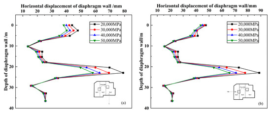 Figure 20 shows the horizontal displacements of the diaphragm wall at section V–V and section VII–VII when the wall adopts different strength concrete. From Figure 20, it can be seen that the strength of diaphragm wall only affects the horizontal displacement above the excavation depth and has no effect on the horizontal displacement below the excavation depth. As the strength of diaphragm wall increases, the horizontal displacement above the excavation depth gradually decreases, but this effect mainly occurs at a depth of 22.5 m. Compared with the strength of 20,000 MPa, the horizontal displacement at 22.5 m depth of section V–V decreases by 12.4%, 20.5%, and 26.5%, in turn, while that of section VII–VII decreases by 12.3%, 20.2%, and 25.9%, in turn. It could be concluded that the change in the strength of the diaphragm wall has similar influence on the maximum horizontal displacement of diaphragm walls, and the influence degree gradually weakens.