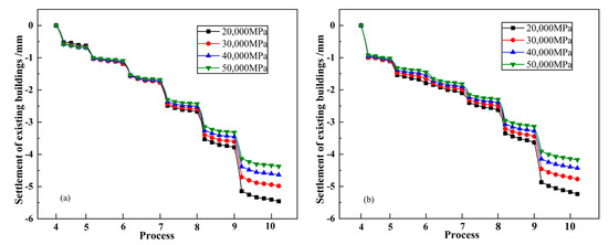 Figure 21 shows the settlement history curves of existing buildings under different diaphragm wall strengths. As shown in Figure 21, the settlement of existing buildings decreases with the increase in the diaphragm wall strengths. The change in strength of the diaphragm wall will not affect the shape of the settlement history curve. Compared with the strength of 20,000 MPa, the final settlement of JC-1 decreases by 8.7%, 15.1%, and 19.9%, in turn, while that of JC-2 decreases by 8.8%, 15.3%, and 20.3%, in turn. The variation in settlement values is very close, which may be related to the fact that the two monitoring points are at the same distance from the excavation surface of the pit.