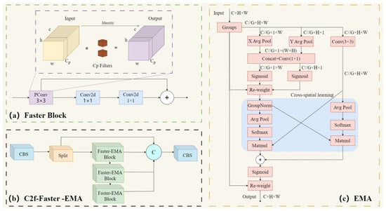 The improved structure diagram of each part of the C2f module: (a) Structure diagram of the Faster Block module and a schematic of the convolution principle. (b) Structure diagram of the C2f-Faster-EMA module after the improvement of the C2f module using the Faster Block and the addition of the EMA attention mechanism. (c) Refined flowchart of the EMA attention mechanism module.