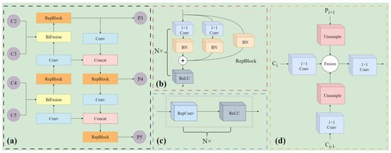 The overall flowchart of the neck part in the fishway fish detection and the module operation process at each stage: (a) Overall flow structure diagram of RepBi-PAN; (b) Operation flowchart of the RepBlock module in the training phase of the RepBi-PAN structure; (c) Operation flowchart of the RepBlock module in the inference phase of the RepBi-PAN structure; (d) Structure diagram of the BiFusion module in the RepBi-PAN process.