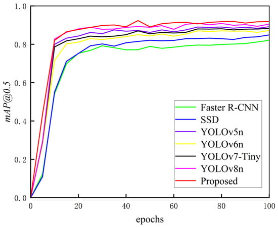 The mAP@0.5 value curve of different detection algorithms after training and testing on the Fish26 dataset.