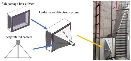 The 3D schematic of the underwater detection system, consisting of a fish passage box culvert and an encapsulated camera, and its installation at the designated location at the fishway inlet after processing and assembly.