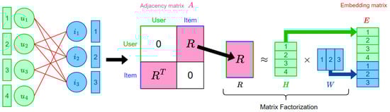 The Figure 1 illustrates the relationship between the matrix factorization process, the original graph, and the embedding matrices. Here, matrix R represents the user–item adjacency matrix, matrix contains user embeddings, and contains item embeddings. The user–item bipartite graph , where , has an adjacency matrix , which can be expressed as follows: