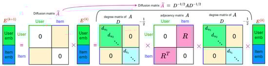 In this context, represents a diagonal degree matrix, and is a diffusion matrix computed from the degree matrix and the adjacency matrix , which only needs to be calculated once. This multi-layer embedding propagation process can be abstracted as follows: