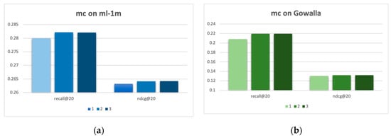 Performance comparison between the different numbers of fully connected layers. (a) represents the performance of the parameter mc on the ml-1m dataset, and (b) shows its performance on Gowalla.