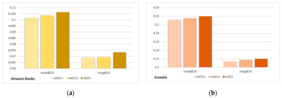 We designed a series of experiments to evaluate the training efficiency of asGCL. We selected two representative models to compare training time and epochs. The LightGCN model features a streamlined architecture and strong interpretability, while LightGCL serves as a paradigm for contrastive learning. As shown in Table 4, LightGCN has the shortest training time per epoch at 85.33 s, but it requires more epochs. In contrast, asGCL has a longer training time per epoch, but it requires fewer epochs at 235, resulting in a reduced total training duration. Thus, our model demonstrates a certain advantage in training time efficiency.