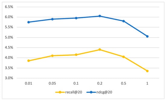 In the contrastive learning module, represents the task intensity. We conducted experiments on the Amazon-Books dataset using various values within the range of [0.01, 0.05, 0.1, 0.2, 0.5, 1]. As illustrated in Figure 7, with the gradual increase in , both recall@20 and NDCG@20 metrics exhibit an upward trend, indicating that the contrastive learning task indeed contributes to the enhancement of model performance. When is in the range of [0.05, 0.1, 0.2], the model demonstrates relatively high and stable performance on the dataset. Notably, when = 0.2, both metrics reach their peak values, signifying that an appropriate weight of contrastive loss in the overall loss calculation can effectively balance the main and auxiliary tasks, thereby improving model performance. However, as continues to increase, both metrics experience a decline, particularly when = 1, where a significant drop in performance is observed. This may suggest that an excessively high task intensity for the contrastive task adversely affects the performance of the primary recommendation task. Overall, it is essential to maintain within a moderate range; setting it too low may fail to leverage the node distribution capabilities brought by the contrastive task, while setting it too high could suppress the primary recommendation task and degrade the quality of the embedding representations from the preceding layers. Therefore, we recommend setting around 0.2 to ensure a balance between the main and auxiliary tasks, aiming for optimal model performance.