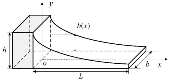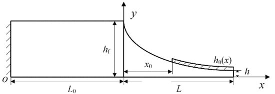 Conventional ABH beams are non-uniform structures and their equation of shape is usually a quadratic function. The detailed dimensions of each part of the structure are shown in Figure 1. L0 and L are the length of the part with an equal cross-section and ABH part, respectively. The heights h(x) of the ABH part satisfied the following quadratic function:
