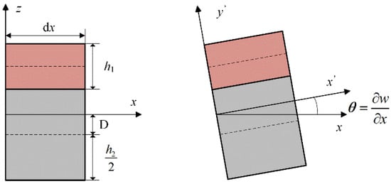 where u1(x, z, t) is the displacement of the coating layer, u2(x, z, t) represents the thickness of the base layer, w is the lateral displacement of the midplane of the beam, z denotes the distance from the plane to the neutral plane, and D is the distance from the neutral plane to the midplane of the base. The corresponding strain relationship can be obtained from the displacement of each layer: