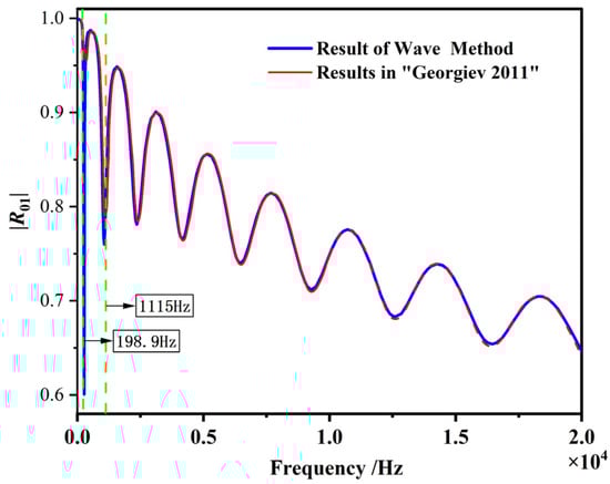 To validate the effectiveness of the wave method in vibration analysis of ABH structures, the absolute values of the elements |R01| in the reflection matrix R of an overlaying ABH beam with the quadratic curve of the shape function obtained by the wave method are compared with the results in Ref. []. The rationale for selecting this study for comparative analysis lies in the fact that the wave-based method is rooted in theoretical mathematical models, which compute the theoretical solution of the reflection matrix R. The simulation parameters are shown in Table 1.