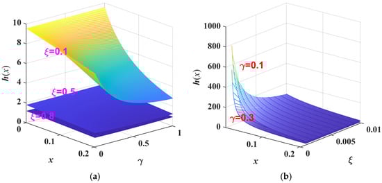 (a) The surface of h(x) changing with x and γ with ξ = 0.1, 0.5 and 0.8. (b) The surface of h(x) changing with x and γ with ξ = 0.1, 0.5 and 0.8.