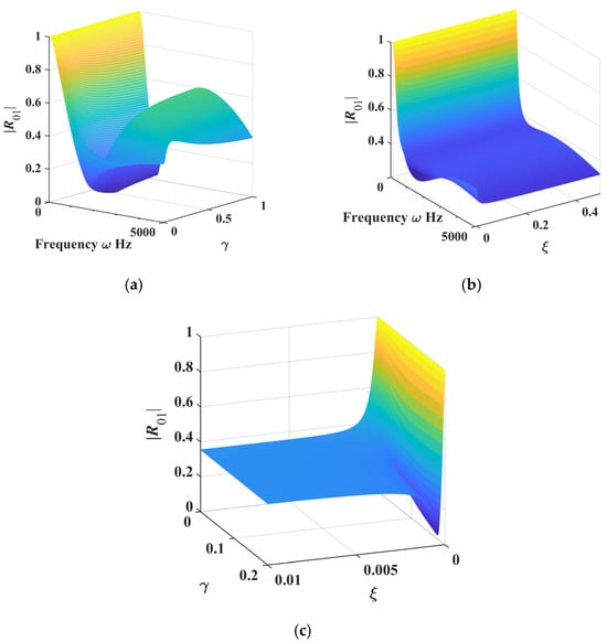 (a) The 3D surface of |R01| with respect to ω and γ when ξ is 0.0005 and h0 is 0.07 mm; (b) the 3D surface of |R01| with respect to ω and ξ when γ is 0.1 and h0 is 0.07 mm; (c) the 3D surface of |R01| with respect to ω and γ when ω is 1000 Hz and h0 is 0.07 mm.