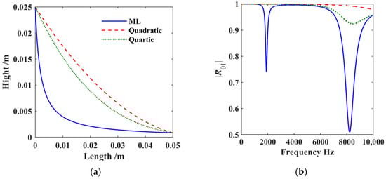 Compared to quadratic and quartic curves, the ML curve exhibits faster decay and a smoother transition to its final value when the three ABH-shaped functions are consistent at both ends. The variation curves of the reflection matrix element |R01| obtained from the three shape functions with respect to frequency ω are shown in Figure 11b when α is 0.5, h0 is 0.7 mm, and x0 is 0. The |R01| curves all exhibit periodic decay, but the values corresponding to the ML shape function are smaller, and they decay faster, which is more beneficial for structural vibration reduction.