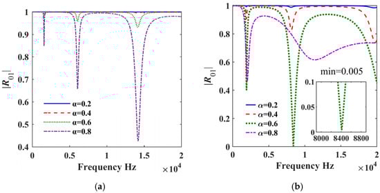 In addition, the relationship curve between |R01| and ω under different film thicknesses and different fractional orders was studied, as shown in Figure 12. Since the truncation thickness is 8.2554 × 10−4 mm, we select two film covering thicknesses h0 of 0.01 mm and 0.7 mm, which are, respectively, smaller and larger than the truncation thickness, as the research parameters. The results show that the fractional order of the model and the thickness of the membrane have significant effects on the structural vibration reduction. The greater the α, the greater the attenuation of |R01|, which also means that the vibration energy is continuously dissipated in the reflection process. This is consistent with the actual implementation. The fractional order reflects the dissipation performance of the coated material. The greater the α, the stronger the dissipation performance of the material, that is, the stronger the damping performance. From the overall results, the greater the film thickness h0, the stronger the damping performance of the material, and the greater the attenuation degree of |R01|. However, in Figure 12b, the dissipation results of α = 0.6 in the high-frequency range are more significant than those of α = 0.8 when h0 is 0.7 mm. This is because the right end of the ABH structure is truncated, and its thickness is 8.2554 × 10−4 mm, which is equivalent to the film thickness of 0.7 mm, and there is a scale effect.