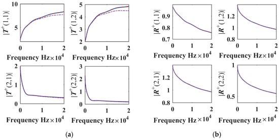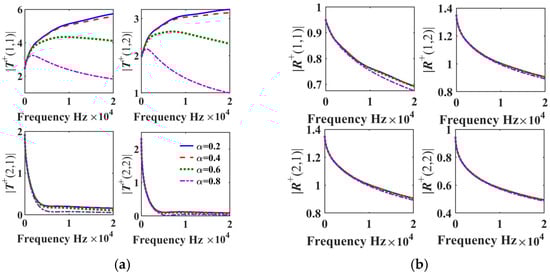 Comparison of transmission and reflection matrices under the value of fractional order α of 0.2, 0.4, 0.6 and 0.8 when the h0 is 0.7 mm: (a) the elements of matrix T+; (b) the elements of matrix R+.