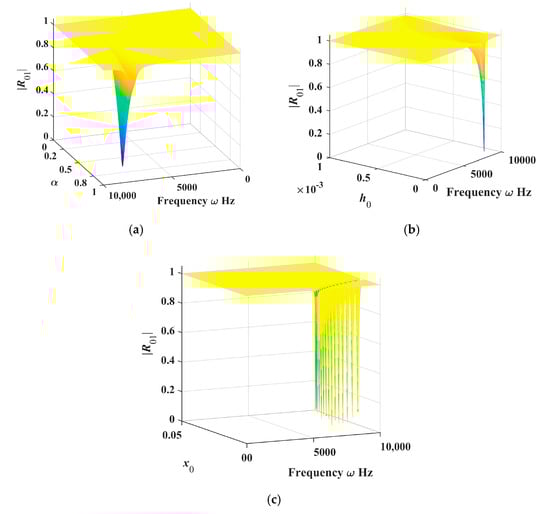 The range of h0 values in Figure 15b is [10−5, 10−3], and there is a significant change in |R01| within the frequency range of [7500 Hz, 8000 Hz] and h0 ≤ 0.0003 mm. |R01| has the smallest value when h0 is 0.0001 mm. The range of x0 values in Figure 15c is [0.001, 0.049]. When x0 falls within the range of [0.001, 0.014] and frequency is within the range of [5300 Hz, 9691 Hz], |R01| can achieve multiple small values, with the minimum value occurring at x0 = 0.2 L. The result is consistent with the optimization results.