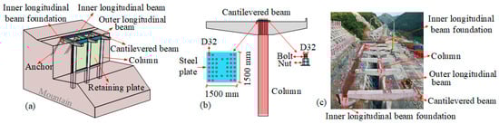 PCSs are highly adaptable to rugged mountainous landscapes and have become the preferred structural solution for mountain road construction [5,6,7]. As illustrated in Figure 1, these systems are composed of multiple prefabricated elements, including inner and outer longitudinal beams, cantilever beams, anchor rods, columns, retaining plates, and their corresponding foundations. Unlike conventional cast-in-place methods, these prefabricated components are produced in a controlled factory environment, ensuring consistent quality and precision. Once transported to the construction site, they are rapidly assembled, significantly improving construction speed while minimizing on-site labor requirements [8]. The assembly process also enhances overall safety, particularly in hazardous construction settings [9]. In contrast to conventional roadbeds, such as those formed by cutting slopes or filling embankments, prefabricated cantilever roadbeds are less influenced by topographical variations, leading to smoother roadway alignments and minimized elevation discrepancies, thereby demonstrating superior adaptability [10,11,12,13].