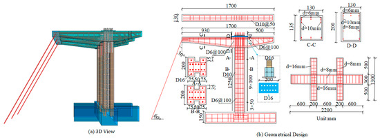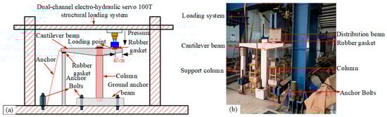 Drawing from the actual engineering structure depicted in Figure 1c, a 1:7.5 scaled-down model of the PCS was designed for both experimental testing and finite element (FE) simulation. As shown in Figure 2a, the scaled structure adopts a three-beam, two-span configuration. The geometric dimensions of the scaled model are presented in Figure 2b. The columns stand at a height of 1250 mm, with a rectangular cross-section measuring 200 mm × 200 mm. The cantilever beams feature a variable cross-section and have a total length of 1700 mm, with the smallest cross-section measuring 130 mm × 100 mm and the largest measuring 130 mm × 200 mm. The cantilever beams are spaced 600 mm apart. The connection between the cantilever beams and the columns is made using 12 bolts, each with a diameter of 16 mm, which are secured with double nuts to prevent loosening. To replicate the anchoring effect of the mountainous terrain on the structure, ground anchor beams were incorporated. These anchor beams are connected to ground anchor rods, which are secured with bolts and steel sections, and are inclined at an angle of 60° relative to the ground. In the constructed test structure, the cantilever beams and columns were made from C50 concrete, while the other components were constructed using C30 concrete. The experimental loading configuration is illustrated in Figure 3. A dual-channel electro-hydraulic servo system with a 100 T capacity was employed for loading. The load was applied to the three cantilever beams via a distribution beam, with the loading points located 45 cm from the column center. During the test, the loading rate was initially set at 0.5 mm/min, which was reduced to 0.2 mm/min once cracks were detected. The loading process was terminated when the structural load capacity fell to 85% of the peak load, after surpassing the peak value.