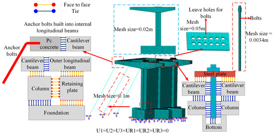 Surface-to-surface contact is implemented to model interactions between key components, such as cantilever beams and columns, columns and retaining plates, outer longitudinal beams and columns, retaining plates and foundation, and steel plates and cantilever beams. A penalty friction coefficient of 0.4 is assigned to tangential behavior, while normal behavior is represented by hard contact. Binding constraints are applied to prevent relative displacement and rotation between columns and foundation, inner longitudinal beams and cantilever beams, bolts and prefabricated holes, and cantilever beams and external longitudinal beams. The anchor rods are embedded within the internal longitudinal beams.