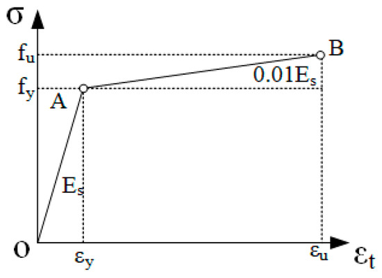 Stress–strain curve of the bilinear hardening model for steel and reinforcement. Note: and represent the ultimate strength and yield strength of the steel, corresponding to the yield strain and ultimate strain , respectively.