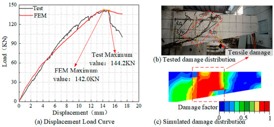 Figure 7 compares the simulated and experimental results for the scaled-down PCS model. The load–displacement curve in Figure 7a shows that the simulation results closely match the experimental data, especially before reaching the maximum load capacity. The ultimate load capacities obtained from the simulation and experiment are 144.1 kN and 142 kN, respectively, with a simulation error of only 1.47%. Figure 7b,c illustrates the damage distributions of the cantilever beam, as observed experimentally and in the simulation, respectively. Under vertical displacement loading, cracks propagate from the loading point toward the base of the cantilever beam, resulting in failure. The simulation results accurately reflect the experimental damage pattern. The high degree of similarity between the simulated and experimental results validates the accuracy of the developed model, which effectively captures the actual stress and damage behavior of the structure. Therefore, the material models and boundary conditions applied in the scaled-down model can be extended to the full-scale PCS model.