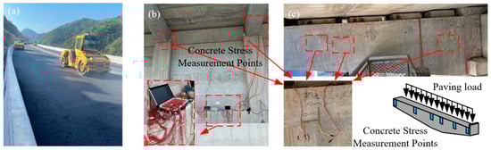 Figure 8a depicts the onsite paving procedure for the full-scale PCS roadbed. Figure 8b illustrates the stress measurement locations on the cantilever beams. Six critical measurement points are identified in Figure 8c as follows: the two beam ends, the junction between varying and constant cross-sections, and the midpoint of the varying cross-section. Stress concentrations are anticipated at the beam ends and at the junction between varying and constant cross-sections. Moreover, notable bending and shear stresses may develop at the midpoint of the varying cross-section due to the paving loads.