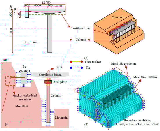 Figure 9 shows the developed FE model for the full-scale PCS roadbed. To minimize the impact of mountain size on the structural response, the mountain body is modeled to be three times the size of the PCS. Figure 9b,c illustrate that the interactions between the cantilever structures, concrete, and reinforcement in the model are consistent with those in the scaled-down model. The bottom and corners of the mountain body are fixed to restrict rotation and displacement, as depicted in Figure 9d.