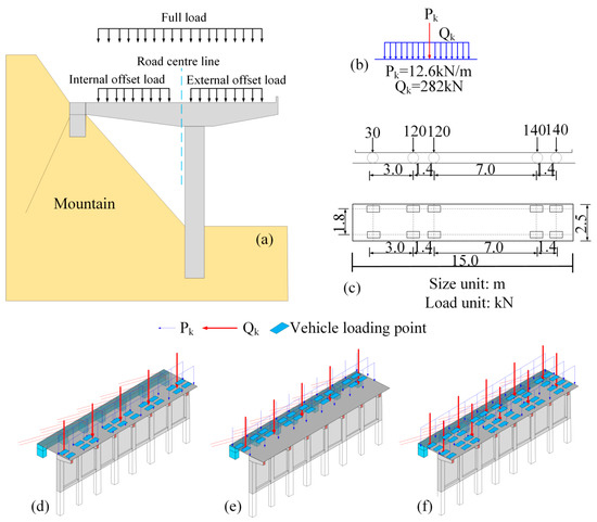 The following three distinct traffic load conditions are considered in this study: (1) external eccentric loading, (2) internal eccentric loading, and (3) full loading. Eccentric loading is considered the most critical stress condition [46,47,48,49]. External eccentric loading applies the load to the outer side of the cantilever, away from the mountain, resulting in outward bending moments. In contrast, internal eccentric loading places the load on the cantilever’s inner side, near the mountain, generating inward bending moments. Full loading distributes the load evenly across the entire structure, representing the maximum load the structure experiences during regular operation. Figure 11a illustrates the schematic of load distributions for these three scenarios. The lane load and vehicle load are determined according to highway design requirements, as shown in Figure 11b,c. The final applied traffic loads for each scenario are presented in Figure 11d through Figure 11f.