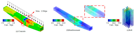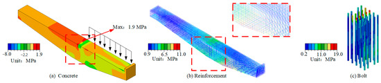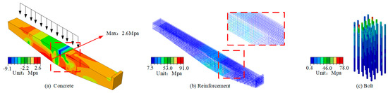 Under full loading, the concrete stress distribution in the cantilever beam is uniform across its middle and upper sections, with the highest principal stress observed at the bottom of the joint, reaching a peak value of 2.9 MPa (Figure 14a). The maximum stress in the reinforcement mesh is similarly concentrated at the bottom of the joint, with a value of 24.4 MPa (Figure 14b). The bolts experience significant stress at their top sections, with the maximum stress reaching 59.2 MPa (Figure 14c).