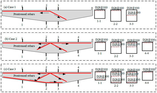 The analysis reveals that the concrete in the cantilever beam experiences relatively high stress, with significant stress concentration and limited safety margins. To improve these safety margins, it is essential to reduce stress in the concrete. One effective solution is the addition of prestressed rebars, which help improve stress distribution and mitigate stress concentration. Prestressing not only counteracts tensile stress in the concrete but also significantly enhances the structure’s crack resistance and overall stiffness [53,54,55]. Based on the findings from Section 3.1, where concrete stress is mainly concentrated at the bottom of the inner end of the beam, three configurations for prestressed rebar placement are proposed, which are illustrated in Figure 15, as follows: Case 1, where prestressed rebars are placed at the upper inner side of the cantilever beam; Case 2, where prestressed rebars are positioned on both the upper inner and outer sides of the cantilever beam; and Case 3, which builds on Case 2 with additional prestressed rebars at the bottom of the inner beam. Each configuration includes six rebars with a 28 mm diameter, spaced 100 mm apart (D28@100), and prestressed to 300 MPa. The main reason for adopting a very low prestress level (300 MPa) in prestressed elements is to prevent the occurrence of unacceptable cracks due to excessive stresses on the components during transportation [22,56]. A lower prestress level reduces the risk of damage during transportation, especially when the components are subjected to transportation vibrations or other external loads. The reduced stress helps effectively decrease stress concentration in the material, thus preventing cracks from forming.